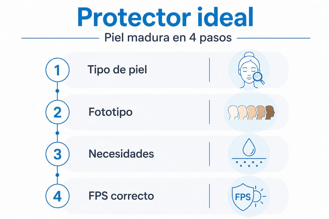 El primer paso para elegir un protector solar eficaz es conocer con exactitud las características de tu piel. No todas las pieles maduras son iguales. Una piel seca de fototipo I necesita una fórmula completamente distinta a una piel mixta de fototipo IV con tendencia a manchas. El proceso de selección inicia evaluando el tipo de piel, fototipo y necesidades específicas como manchas o pérdida de elasticidad.